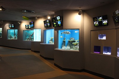 当館の本館内「マングローブの水辺」、「南の海の魚たち」、コーナーにおきましては、工事が完了いたしましたので、展示を一部再開しております。